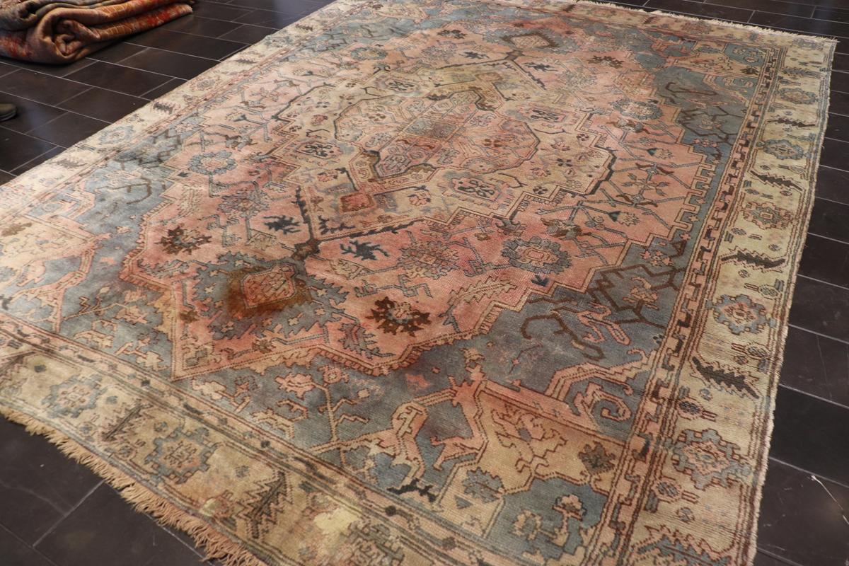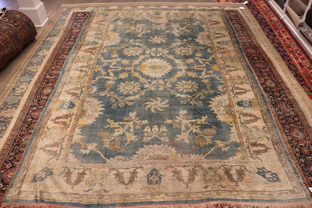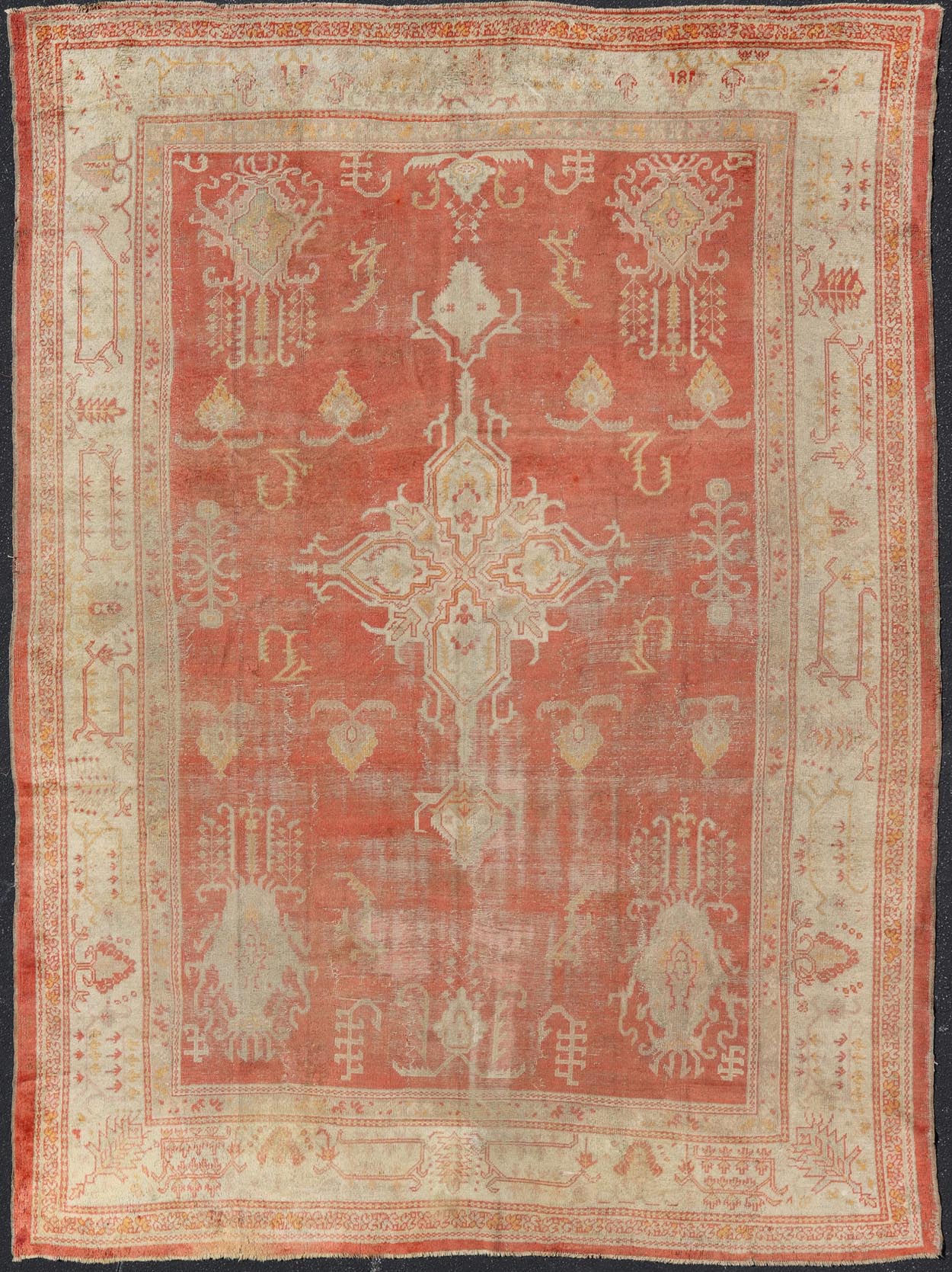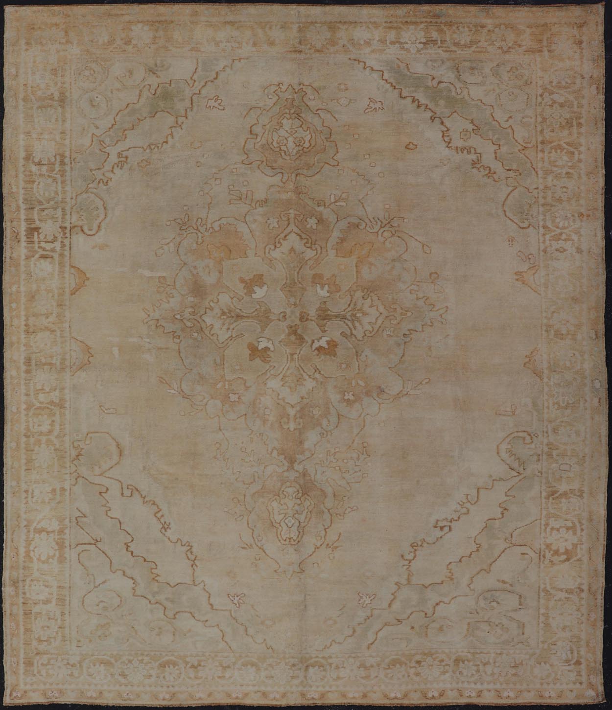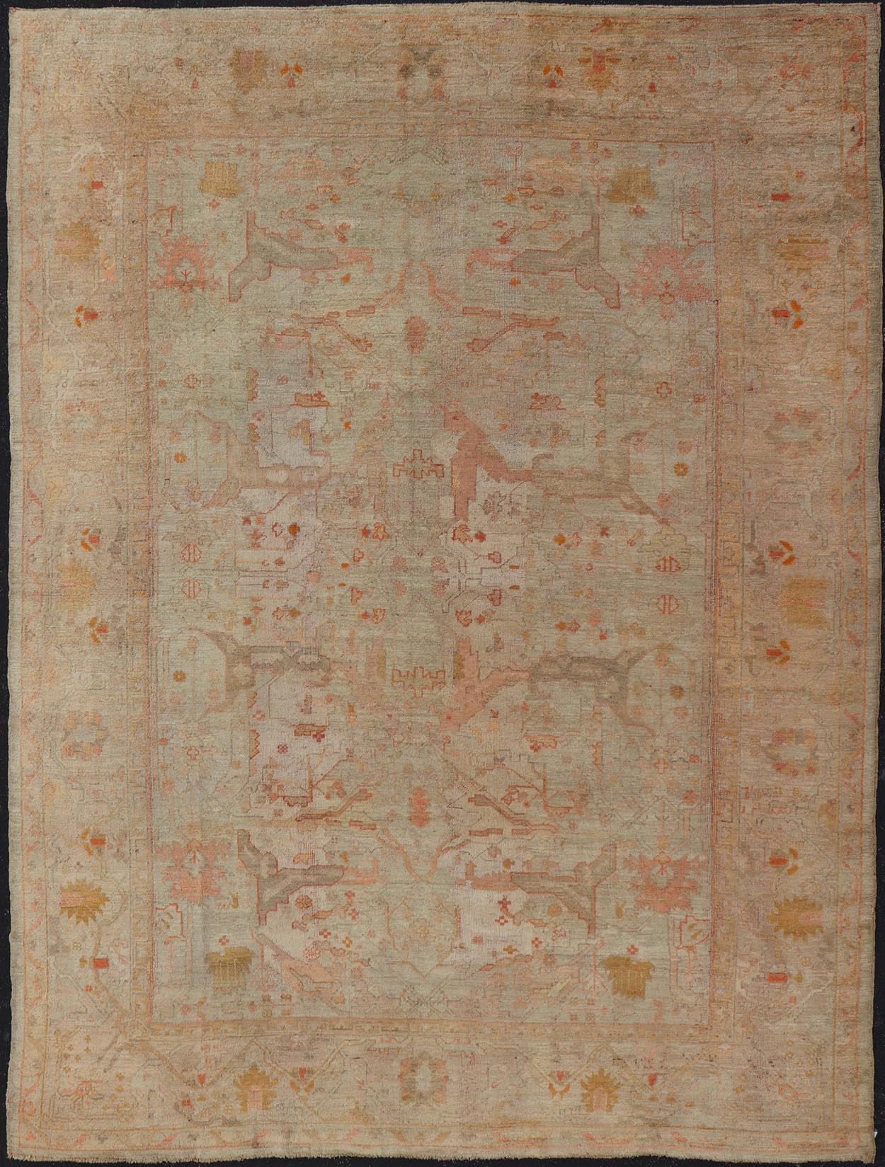 This traditional Oushak rug from Turkey features a subdued, neutral color palette and an all-over design of floral shapes, surrounded beautifully by an all-encompassing, complementary border. This piece is very versatile and will function well in a variety of interiors.